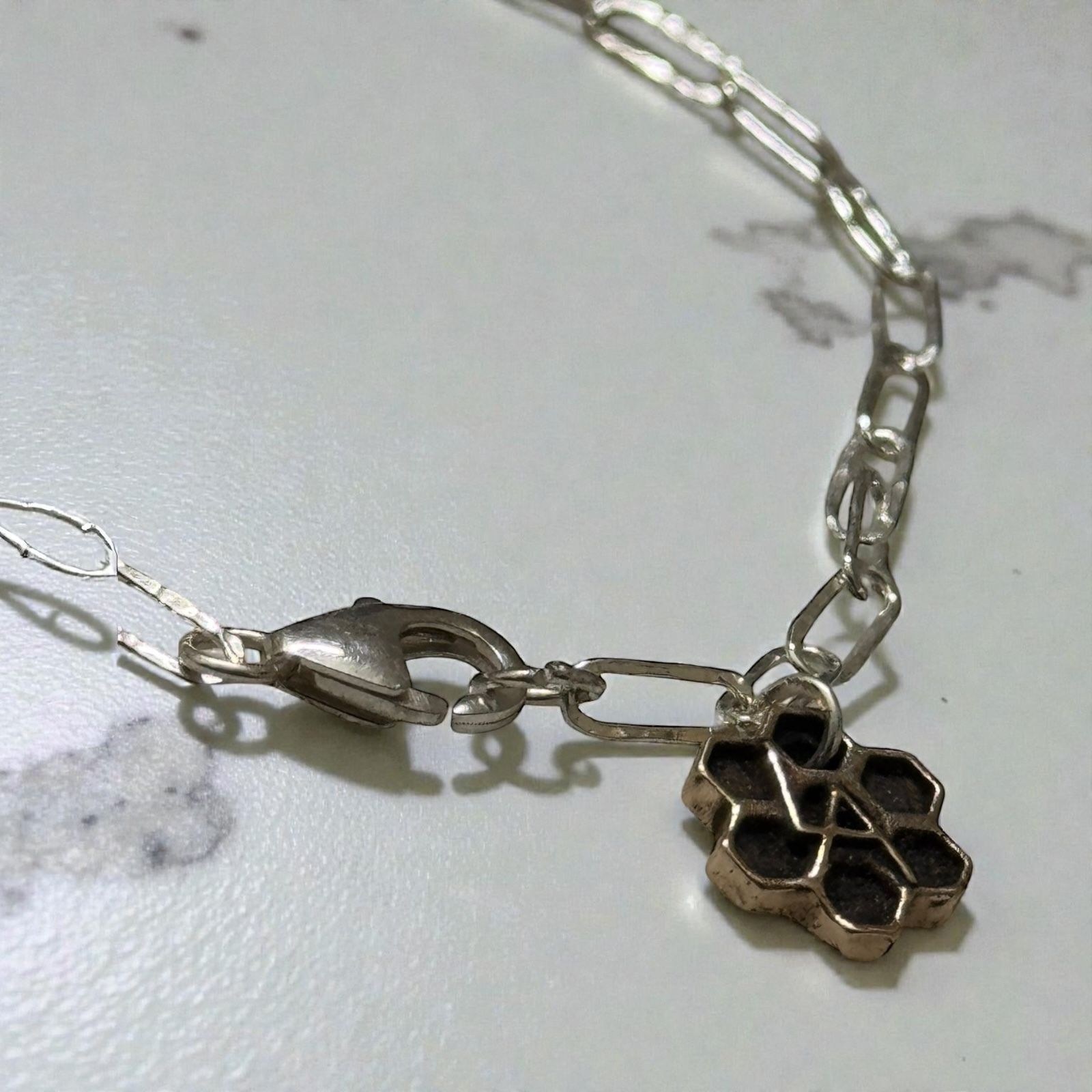 The Hammered Oval Charm Bracelet is designed for everyday wear with a clean, understated presence. Its oval cable chain features subtle hammered facets that reflect light naturally while maintaining a lightweight, comfortable feel on the wrist.